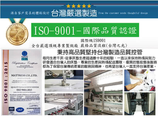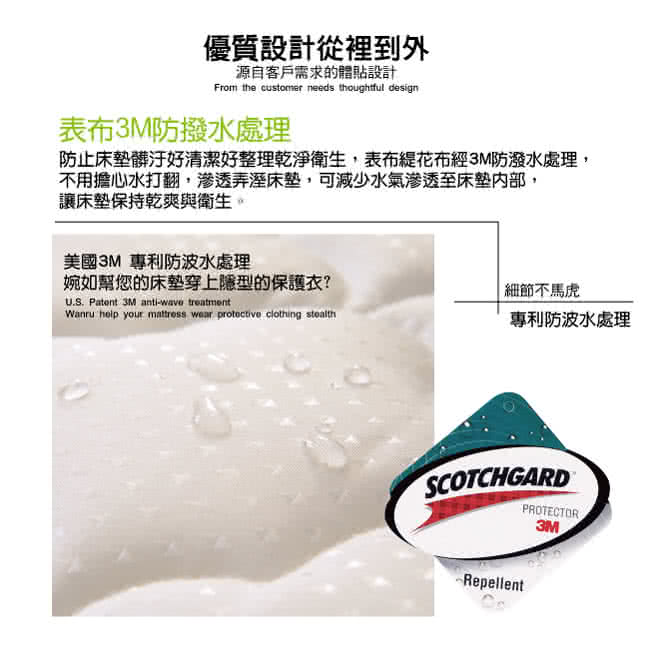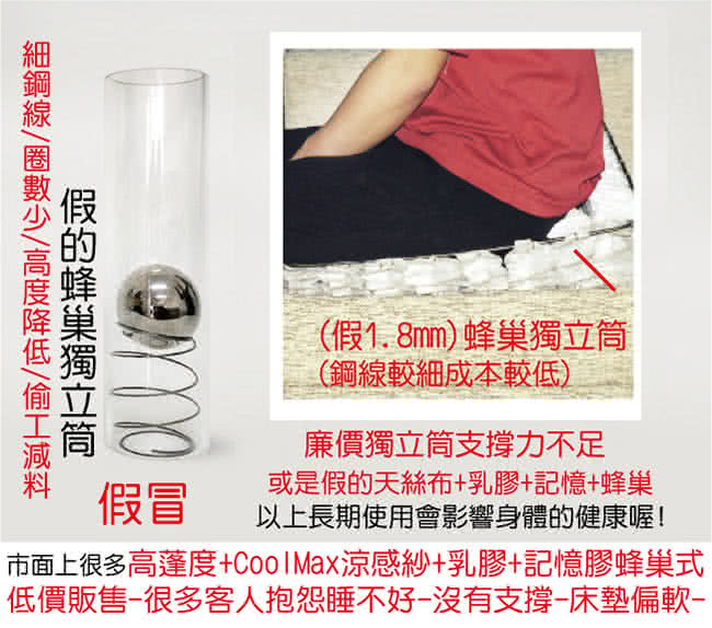 100%台灣製作嚴選專業廠生產-飯店級加厚內材睡起來更舒適-3M防潑水表布乾淨抗菌衛生好處理-蜂巢式獨立筒-比一般多出15%支撐-正反兩面都可睡